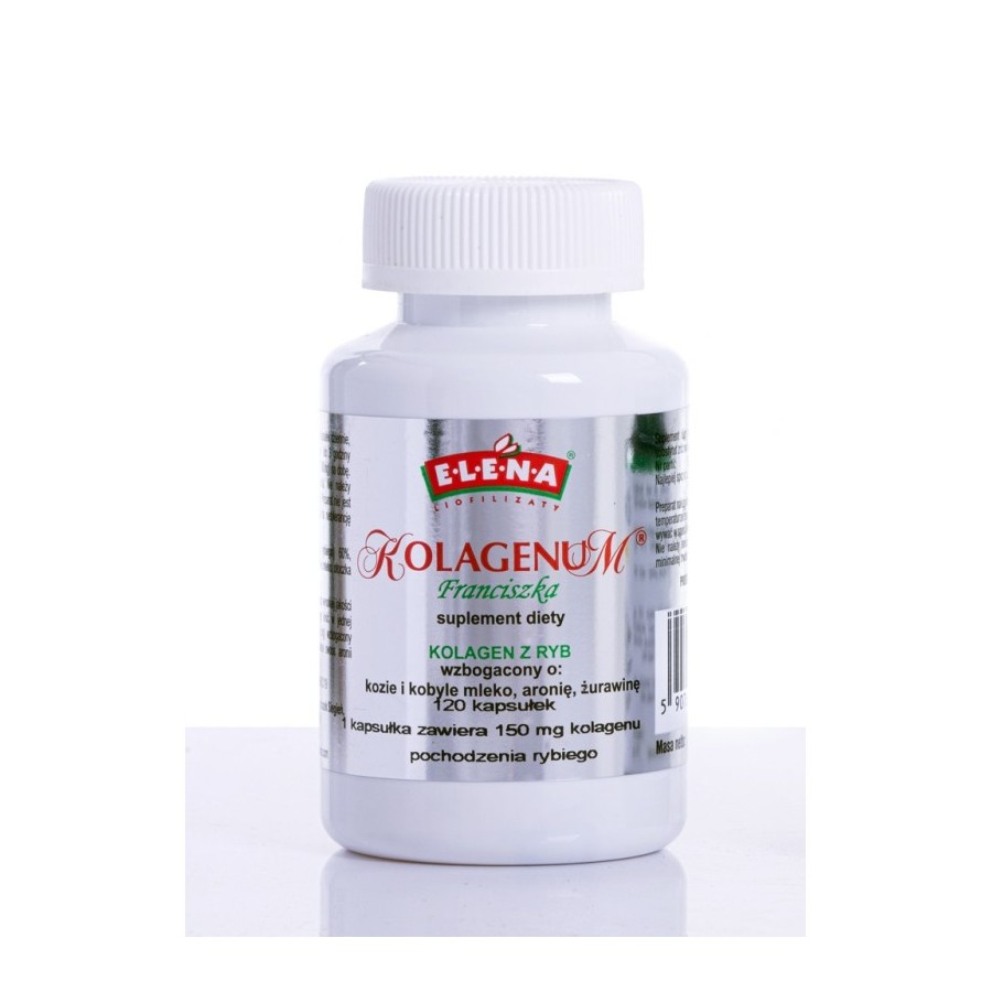 Collagenum is a dietary supplement consisting of high-quality hydrolysed collagen from fish (the amount of which is 150 mg in 1 capsule and 450 mg in 3 capsules) enriched with freeze-dried goat and mare's milk and freeze-dried chokeberry and cranberry fruits.
